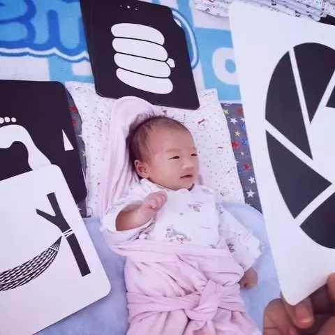 由于新生儿的这些视力特点,在宝宝0~3个月的时候,用黑白对比强烈,轮廓鲜明的黑白卡来让宝宝练习注视和追视,以促进视力发展,预防对眼、斜视。同时,黑白卡练习还能训练左右脑、提升观察力、培养好奇心和探索能力,对宝宝的视力发展和大脑发育都有很大的好处。