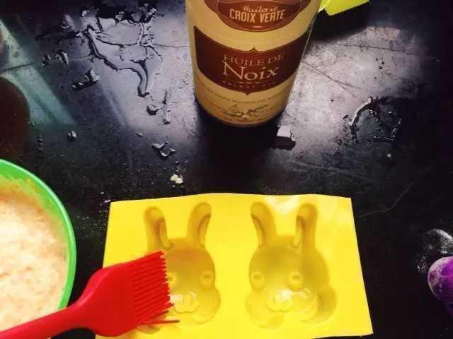 4、模具刷一层油,倒入面糊至模具的一半高。