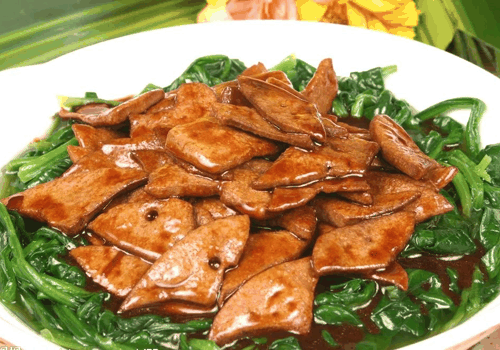 4.加入菠菜和猪肝快炒,炒到猪肝不见血色为止。