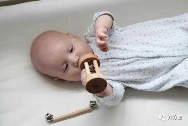这个玩具有着同样的道理,一只手抓住摇铃,摇一摇听听铃声,交接到第二只手,第一只手松开,再摇一摇。周而复始地锻炼手部的运动,抓握和交接,都为六个月之后有意识性的手部运动打下基础。
