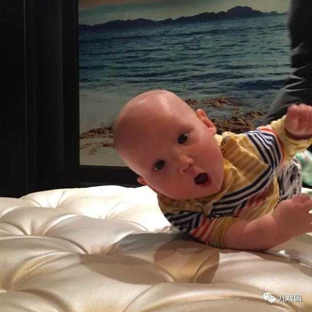 他翻过来了可以再增加一点难度,把他放成趴的姿势(这个姿势真不那么好受),鼓励他侧身翻。每次他们的尝试我们都要用夸张的反应,这时他们才会动力满满地继续尝试。