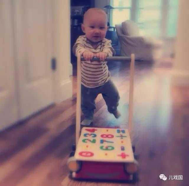 例如哥哥快会走路时推着这个手推车就能很稳当得向前,扶着把手就能坐下来