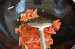 4、锅底留油,炒香葱姜,下西红柿块翻炒至出沙。