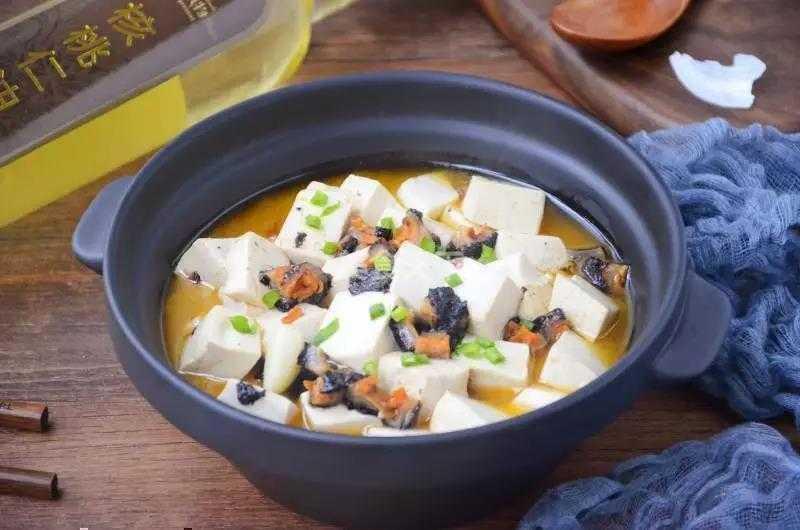 材料:嫩豆腐1块,海参50克,盐,姜片、葱少许、大蒜头3瓣、油适量