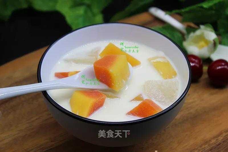 4、倒入牛奶要浸没雪梨块、木瓜块。