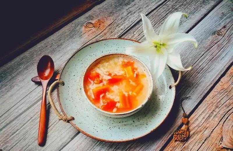 4、木瓜和冰糖放入、煮至木瓜软糯,汤浓米糯关火。