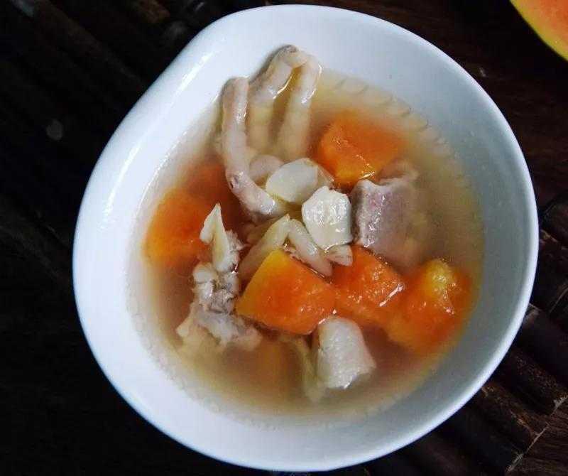 材料:木瓜半只、麦冬20克、百合20克、凤爪5只、猪脊骨200克
